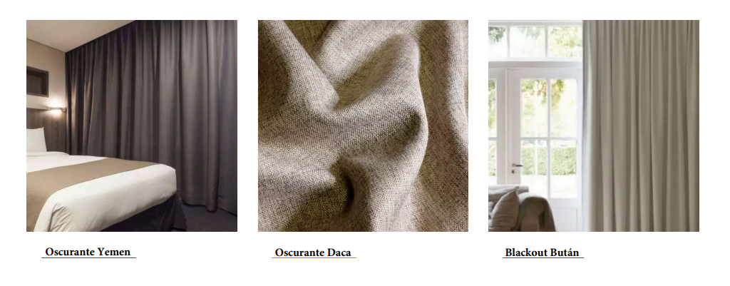 Nuestra gama de cortinas opacas para hoteles demuestran un compromiso con la innovación y la calidad, presentando tejidos que no solo bloquean la luz y el calor, sino que también añaden un elemento estético atractivo a las habitaciones. Nuestras cortinas oscurantes, como las series oscurante Yemen y oscurante Daca, son ejemplos perfectos de nuestra dedicación a la calidad.