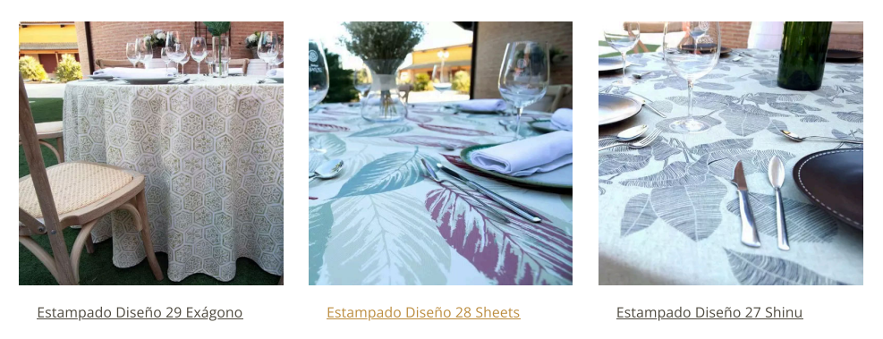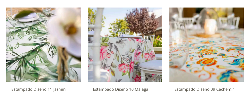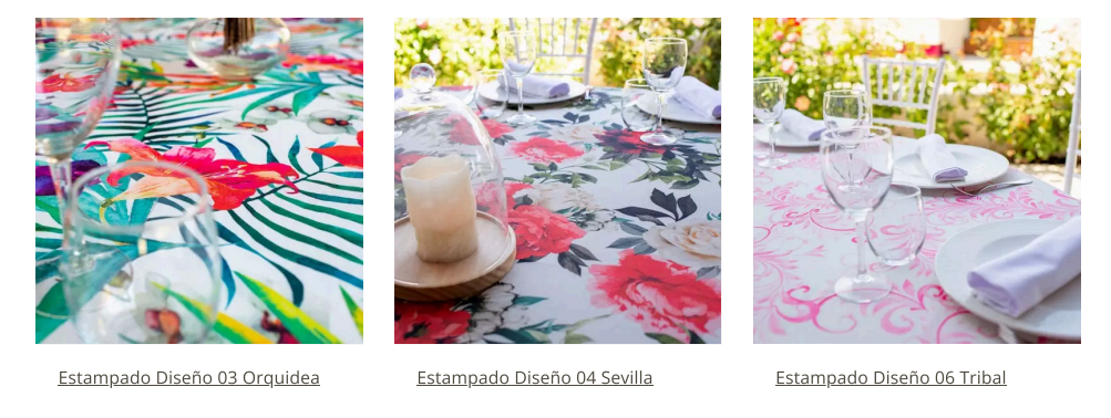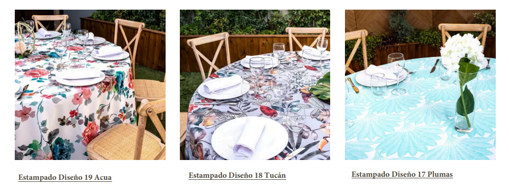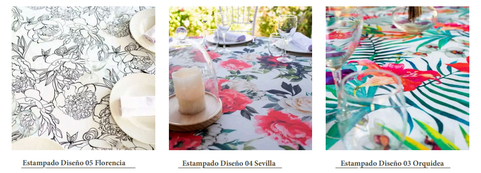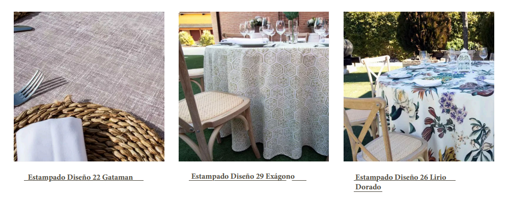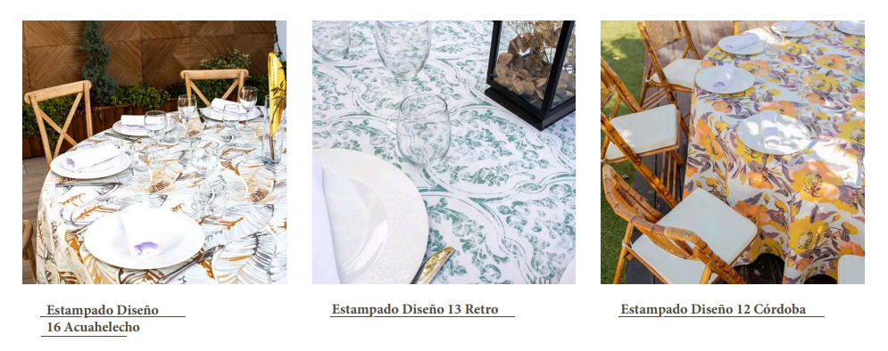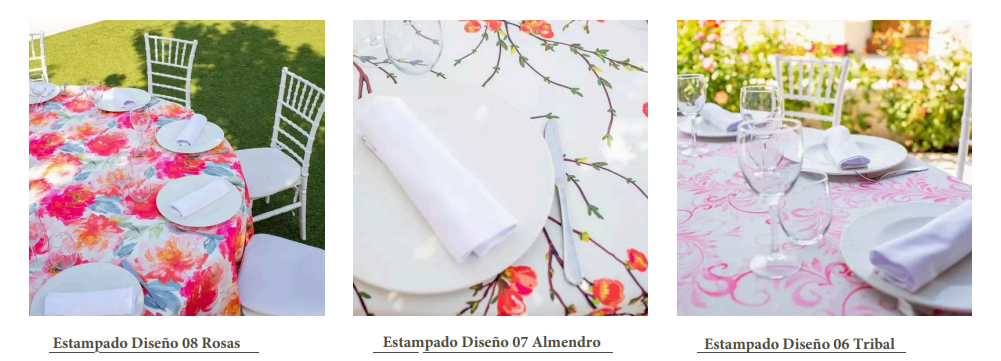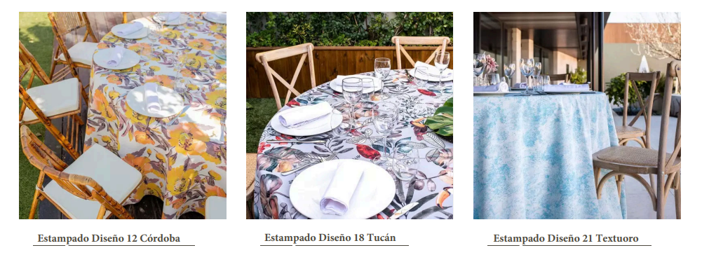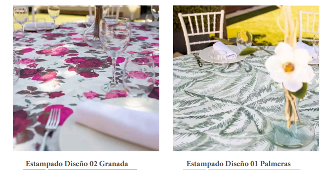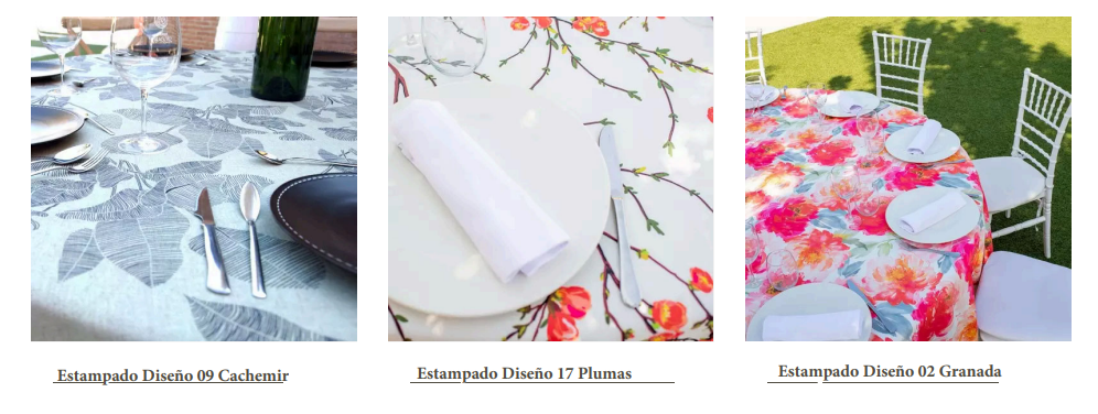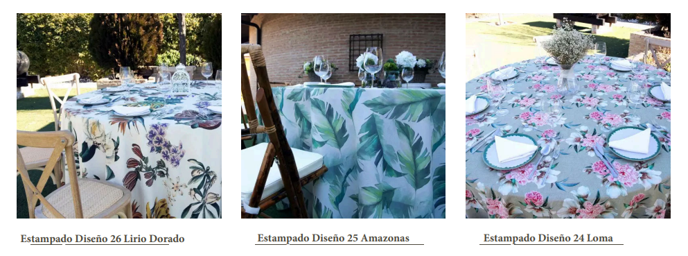 Fabricamos mantelería estampada para bodas con diseños atractivos y manteles estampados para eventos con diseños más discretos y funcionales. Los manteles estampados de Cortinajes Buendía ofrecen una gran durabilidad y no pierden color ya que están fabricados con tejidos y técnicas de última generación.