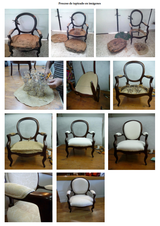 Estas técnicas son realizadas con la correcta utilización de finos materiales en su interior como la pluma, el poliéster, espumas de alta densidad, el crin vegetal , el sistema de muelles y cinchas, combinando las terminaciones con vivos, doble vivos,botones, tachuelas o pasamanería. Pero uno de los secretos más importantes en la tapicería de muebles está en la preparación del esqueleto o estructura a tapizar.